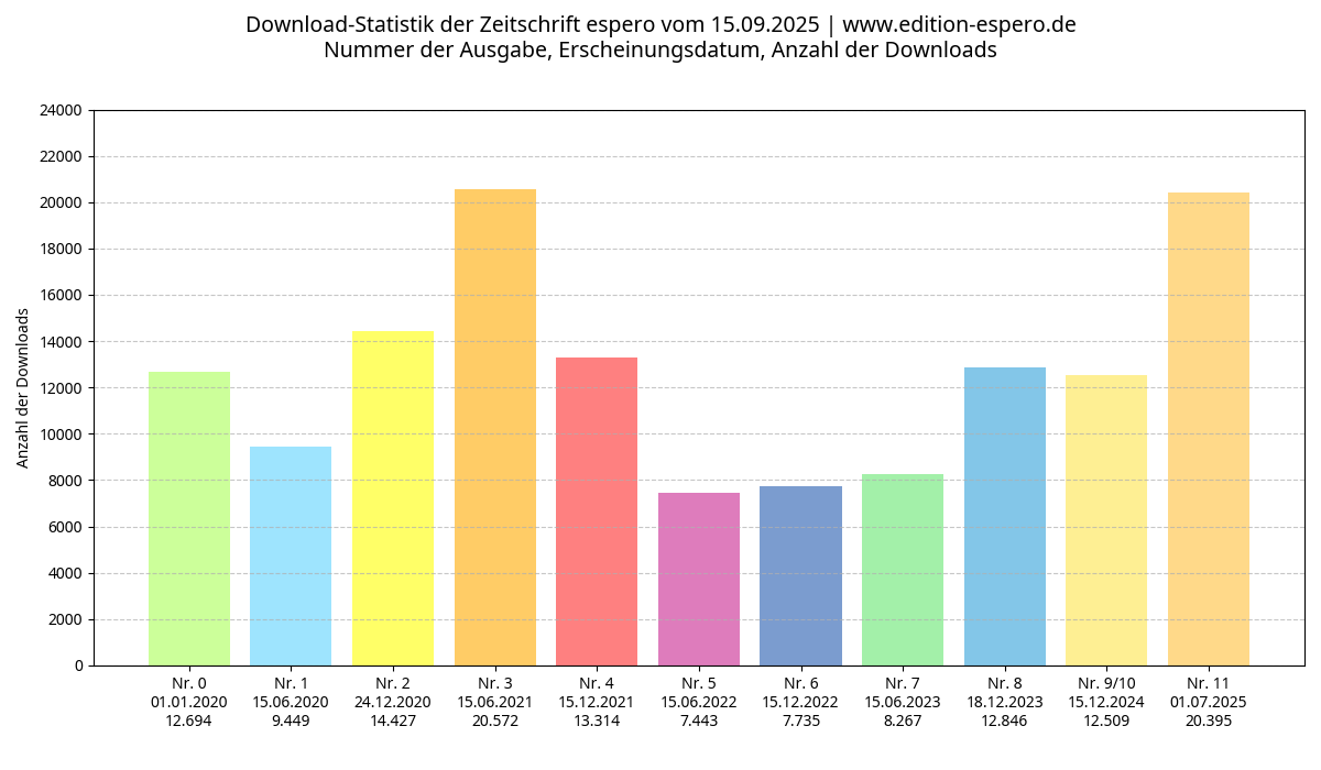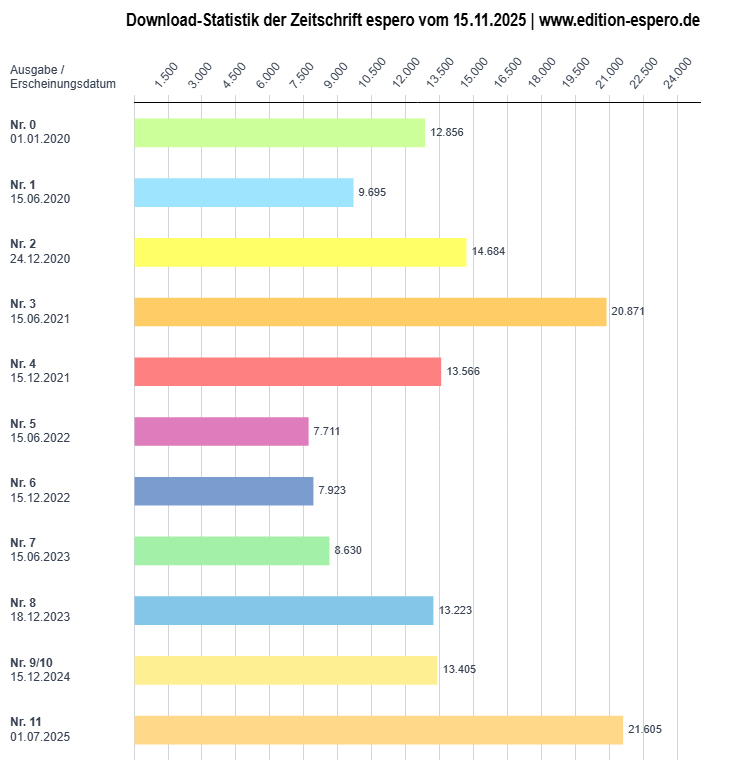 Hier findest Du alle bisher erschienenen Ausgaben der Zeitschrift espero zum kostenlosen Download. Durch einen Klick auf die jeweilige Ausgabe gelangst Du zur zugehörigen Seite mit weiteren Informationen – inklusive Editorial und Inhaltsverzeichnis. Du kannst auch unsere Zeitschrift per E-Mail an abonnieren. Als Abonnent:in erhälst Du dann per E-Mail eine Mitteilung über die aktuelle Neuerscheinung inkl. dem Download-Link zum Herunterladen der neuen Ausgabe.